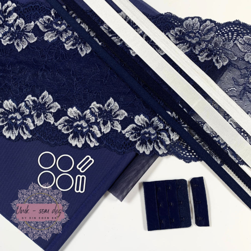 Dette delikate og vakre settet med navy blå med hvite blomster blonde, fôret med navy blå powernett, er satt sammen til bralett mønsteret Sweet Sixteen Bralettes. Unn deg selv en lekker, superbehagelig og stødig bralette.