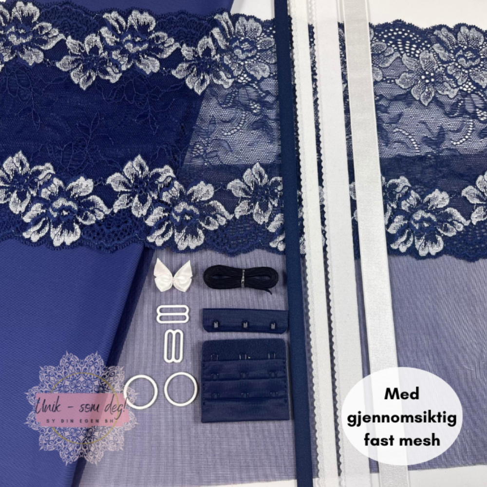 Et nydelig ferdigklippet sett, satt sammen av navy blå duoplex eller fast mesh og powernett, og en lekker blå blonde med hvite blomster. Med matchende tilbehør. I dette BH-settet finner du alt av materialer du trenger for å sy en BH.
